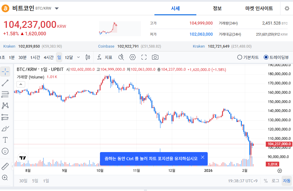 비트코인은 한화 기준으로 1억원이 깨졌다가 다시 올라왔을 정도로 시장 전체가 흔들리고 있는 상황이에요!!
